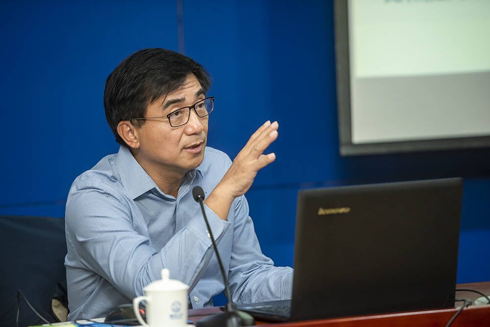 “三元名家论坛”,为在校师生作了题为《数学推动现代科技----从华为重视数学谈起》的学术报告。他首先介绍了华为在欧洲多国家设立了数学研究所,广泛吸纳数学领域高精尖人才,将把握数学领域尖端技术看作企业发展的重要战略,阐明数学理论在当今科技发展中的重要作用。随后,汤涛院士介绍了数学史上在计算机科学领域奠定基础的数学家们,从不一样的角度介绍了计算机科学的发展史。最后,他回归到了“数学到底是什么”这个根本问题上来,从信息科技、科学计算、以及金融数学的发展展示现代数学的魅力和影响。