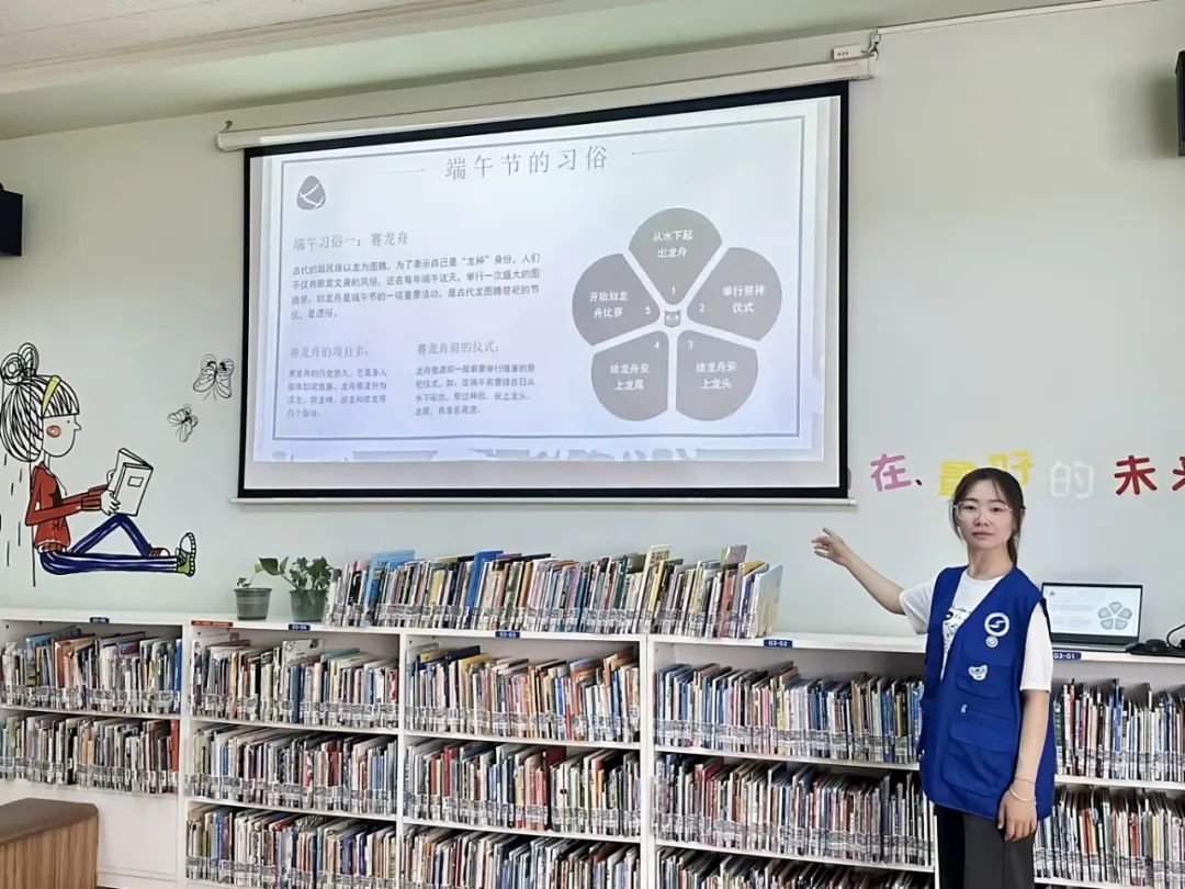活动伊始,志愿者带领孩子们吟诵经典《端午》诗篇,朗朗童声如清泉流淌,在图书馆的角落漾开节日的诗意。随后的“端午绘本课堂”环节,志愿者以《端午节》绘本为引,串联动画短片与角色扮演,生动讲述了端午节的起源与历史文化。通过“屈原投江”经典情节,带领小朋友们跟随故事脉络,逐步了解端午节背后的家国情怀与民间智慧。活动中讲到“挂艾草、赛龙舟、包粽子”等习俗时,孩子们纷纷举手,分享自己家端午风俗,现场气氛热烈.