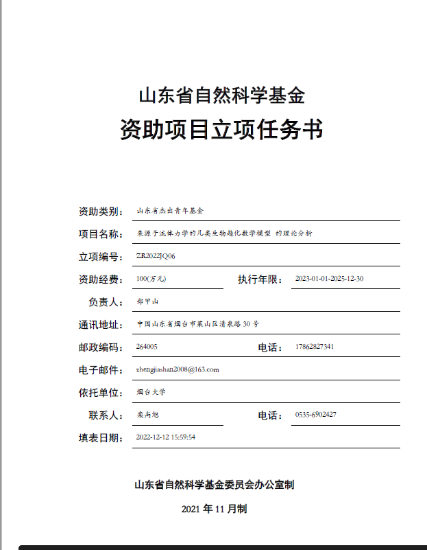 信息与统计教工党支部党员郑甲山同志主持申报的项目“来源于流体力学的几类生物趋化数学模型的理论分析”获山东省杰出青年基金项目资助,实现了性吧